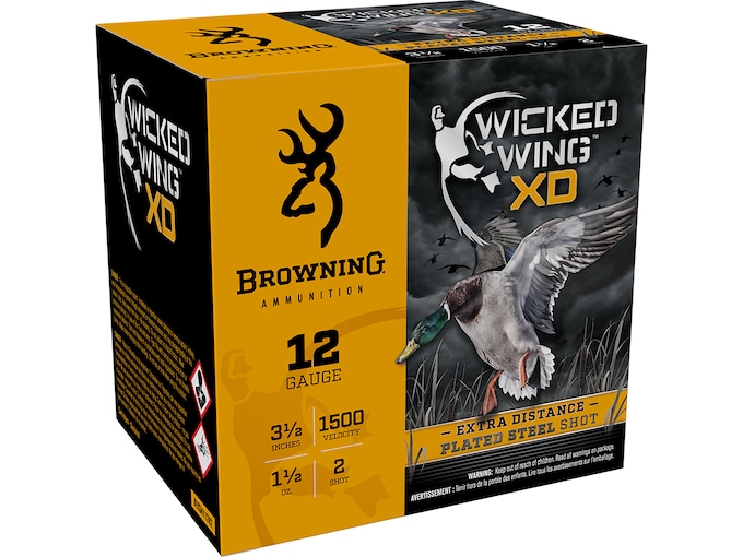 BXD Waterfowl Extra Distance is launched at high velocities utilizing an optimized long-range wad and plated round steel shot. Combining round steel with a cutting edge wad design results in a lethal combination of energy retention, penetration and pattern density that is critical in achieving long-range performance.  A global leader in offering quality and innovative firearms, Browning now introduces a new, full-line of superior performance ammunition for hunting, personal defense and target shooting. Browning and Winchester developed this full line of ammunition products under the Browning brand. The Browning Ammunition portfolio includes popular ammunition offerings in rifle, shotgun, handgun and rimfire, featuring advanced technologies for hunters and shooters. FeaturesHigh VelocityMaximum downrange energyFocused energy deposit
