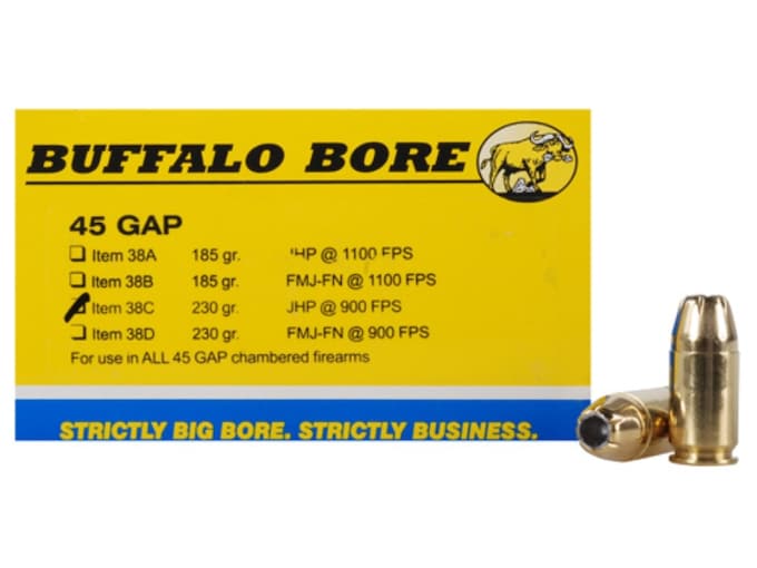Buffalo Bore ammunition is loaded to be some of the most powerful and highest quality ammunition available in . Buffalo Bore Premium Heavy ammunitions is considered safe to use in any 45 GAP chambered firearm that is in normal operating condition. This ammunition is new production, non-corrosive, in boxer primed, reloadable brass cases.