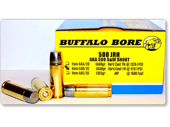 Buffalo Bore loads their ammunition up to maximum SAAMI specifications, which delivers devastating performance on a wide range of game. Please note that this ammunition is not intended for older guns. It is made for modern firearms only, as some of the ammunition could damage older and weaker firearms. This ammunition is new production, non-corrosive, in boxer primed, reloadable brass cases. This ammunition is designed to be a mild recoiling load that still has a high degree of utility. It will still penetrate 5 to 6 feet through muscle and bone. It will not hit as hard because of its lower velocity and therefore will not do as much damage along its path, but with that big flat nose, it will still make a 50 caliber hole along that terminal path. This bullet is hard cast, properly lubed and gas checked and will not cause lead fouling in any normally functional barrel. The 500 JRH cartridge was designed by gun builder Jack Huntington to fit the Freedom Arms model 83 and other similarly sized revolvers. As such, it has nearly the same case head (.006 smaller in diameter) as the 500 S&W. With its slightly smaller case head, it will fit the tight ratchet system of the Freedom Arms model 83 and will still work great in any 500 S&W firearm.