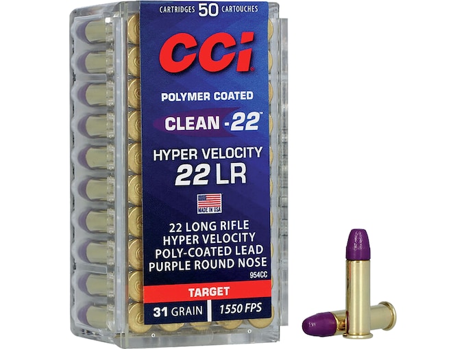 CCI Clean-22 Hyper Velocity clocks in at 1,550 fps, while the advanced polymer coating on the 31-grain lead round nose bullet reduces fouling, especially in suppressed rimfires. Now you can get all the benefits of exclusive Clean-22 technology with the flat trajectories and power of an extreme-velocity load.