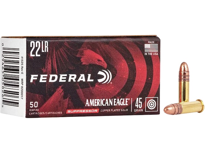 American Eagle Rimfire Suppressor rounds perform to their ballistic peak in suppressed firearms, thanks to carefully selected propellants, bullet weights and primers. Their sub-sonic loading eliminates the super-sonic “crack” suppressors can’t silence. In addition, special clean-burning powders minimize fouling while reliably functioning in semi-automatic firearms. Suppressor loads are priced for volume shooting.