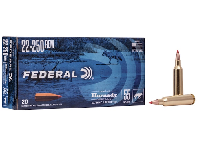 Federal Premium Varmint & Predator Ammunition is made to destroy everything from prairie dogs to coyotes with the precision of Federal’s well-known quality. These loads bring the accuracy and explosive expansion of the proven Hornady V-Max bullet, loaded with our extremely reliable brass, primer and propellant. This ammunition is new production, non-corrosive, in boxer primed, reloadable brass cases. Hornady’s V-Max Bullets feature a polymer tip which enhances accuracy and promotes devastating expansion. The tip raises the ballistic coefficient for faster velocity and also acts as a wedge, initiating bullet expansion. The boat tail creates in-flight stability for long-range shooting. Hornady’s swaging process creates precise formation of the core around the tip of the bullet, creating a build-up of energy which contributes to its phenomenal performance. The copper jacket provides the necessary bearing surface for maximum stability out of the barrel, and the jacket is built to withstand the fast twist rates of the most advanced varmint rifles. FeaturesHornady V-Max bullet provides explosive performance on impactConsistent accuracyReliable Federal brass and primerPriced for high-volume shooters