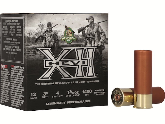 Hevi-Shot Hevi-XII Ammunition is the original Hevi-Shot, now in a 25-round box. Introducing Hevi-XII. Shoot three shot sizes smaller than steel for the same lethality with 28% more tungsten pellets on target. The end result? More kills, fewer cripples, better stories. Pack Hevi-XII in and walk out carrying extra weight. FeaturesHEVI-XII is 12.0g/cc. 53.8% more dense than steelSmaller and more dense pellets penetrate deeperMore lethal pellets in a tighter pattern