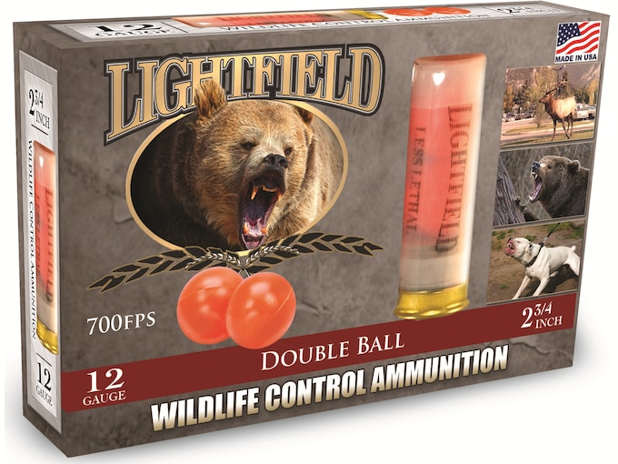 Lightfield has developed a full line of less lethal ammunition for Wildlife Control Professionals. The aversive conditioning of large, heavy muscled animals is a growing trend with specific range demands. The new Lightfield line includes patent pending designs with velocity and kinetic energies calibrated for range specific applications. The new line is intended exclusively for wildlife control and provides effective and affordable solutions for close, mid-range and extended range targets. Lightfield believes ammunition that is safe and effective at close range on humans may be underpowered for large animals at greater ranges. Likewise, loads that are effective at extended ranges may be too powerful for humans at close range. In response to that situation, Lightfield has calibrated its wildlife control line into the following basic classes: Close range 8-25 yards, Mid-range 15-40 yards and Extended range 30+ yard. This load is an improvement on traditional rubber buckshot. This load has two projectiles rather than many smaller ones. The two larger balls carry kinetic energy farther than small ones and are more effective at greater distances. The bore sized projectiles also enhance accuracy at greater distance. The two balls divide the total energy across two impact points, creating a strong pain stimulus without penetration.