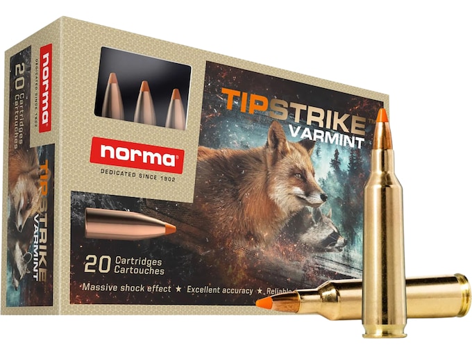 Norma TIPSTRIKE is developed for stopping power, combined with a penetration deep enough to reach the vital organs of the game. The polymer tip assures the expansion and gives a devastating shock effect due to the construction of the bullet jacket. To maintain a high retention weight, the jacket is reinforced with a mechanical lock, thus making TIPSTRIKE an outstanding bullet for driven hunts and other forms of hunting where an immediate stop is crucial. This ammunition is new production, non-corrosive, in boxer-primed, reloadable brass cases. FeaturesPolymer tip for improved ballistics.The insertion of the tip gives a slight delay of the expansion to enhance penetration.Devastating chock effect through a tapered and quick opened front part of the jacket.Penetration secured through a strong and straight rear part of the jacket combined with a internal mechanical lead lock.