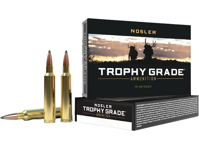 Nosler Trophy Grade ammunition is high quality, production-run ammunition manufactured to strict tolerances and inspected as it is hand-packaged. Trophy Grade features Nosler Custom brass and the dependable, high performing bullets you know and trust. This ammunition is new production, non-corrosive, in boxer primed, reloadable brass cases.