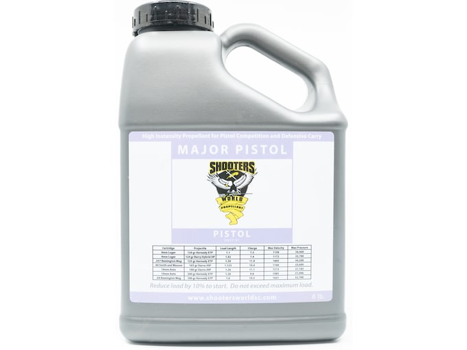 This propellant is a canister form of Lovex D037.1 reloading propellant. It is similar in burn speed to ACCURATE No. 7, 2400 and Blue Dot. The gas generation rate is appropriate for cartridges of the 9mm and 10mm Auto, .357 SIG, .45 Colt, .410 Shot shell, light-bullet magnum pistol loads, and other high intensity pistol cartridges. It is especially good for short barrel magnum revolvers, where complete combustion, high velocity and low muzzle flash are desired. It is also possible to achieve extremely high velocities in 9mm Luger with Major Pistol. A spherical propellant, Major Pistol meters through charge plates consistently and will work with high-speed loaders with very good flow. It does contain a level of flash suppressant.Warning About Smokeless Powder: Do not exceed the loads displayed in the reloaders guideNever mix any two powders regardless of type, brand, or source Never substitute any smokeless powder for Black Powder or any Black Powder substitute