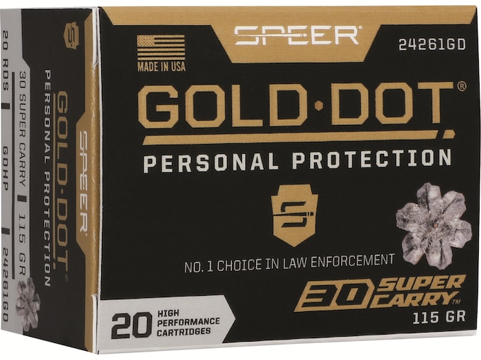 Speer Gold Dot Ammunition is loaded with bonded core bullets and designed for home defense and personal protection. Bonding the jacket to the core means the elimination of core-jacket separations and superior weight retention. This ammunition is new production, non-corrosive, in boxer primed, reloadable nickel-plated brass cases.