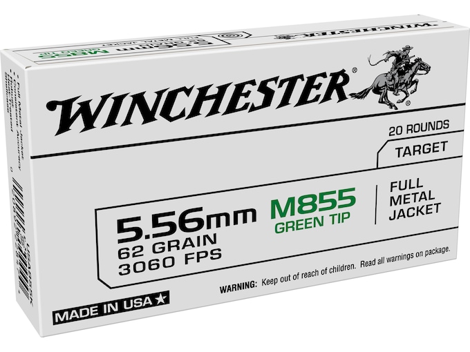 Winchester USA Ammunition 5.56x45mm NATO 62 Grain M855 SS109 Penetrator Full Metal Jacket is loaded to NATO specifications. It is not intended for use in commercial bolt-action rifles chambered in 223 Remington. The full metal jacket bullets feature a steel core and green penetrating tip. Brass cases are reloadable. Â No matter which Winchester ammunition you choose, when you load up with Winchester, you’re getting precision technology, the highest quality components, optimum reliability and superior performance. Â Please Note: While the 5.56x45mm will fit in a .223 Remington chamber, the 5.56 is a military round that runs at higher pressures than its .223 counterpart and is not recommended to be fired in a .223 Remington Chamber.